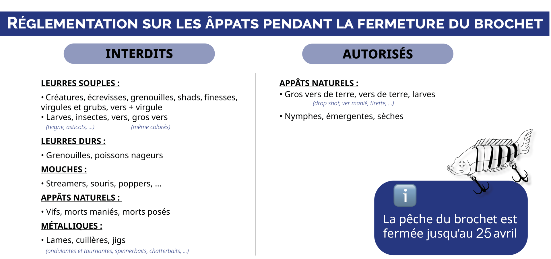 La pêche du brochet en 2ème catégorie ferme le dernier dimanche de janvier et rouvre le dernier samedi d'avril. Sachez que dans le Haut-Rhin vous pouvez continuer à pêcher le sandre jusqu’au deuxième samedi de mars, celui-ci ne se reproduit pas avant cette période. En revanche, la pêche du black-bass ferme fin janvier mais ne rouvre que le dernier samedi de juin. Quant à la pêche de la perche et du silure, elle ne ferme pas.